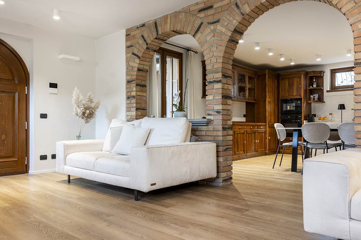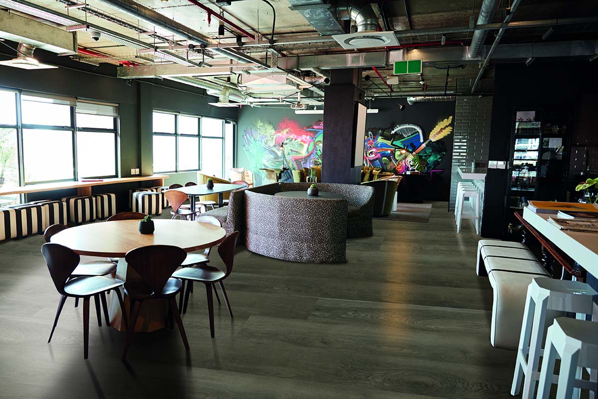 Pavimento inpolvere minerale, rigido, effetto legno, con spessore 6 mm, spazzolatura a registro e materassino IXPE incorporato.