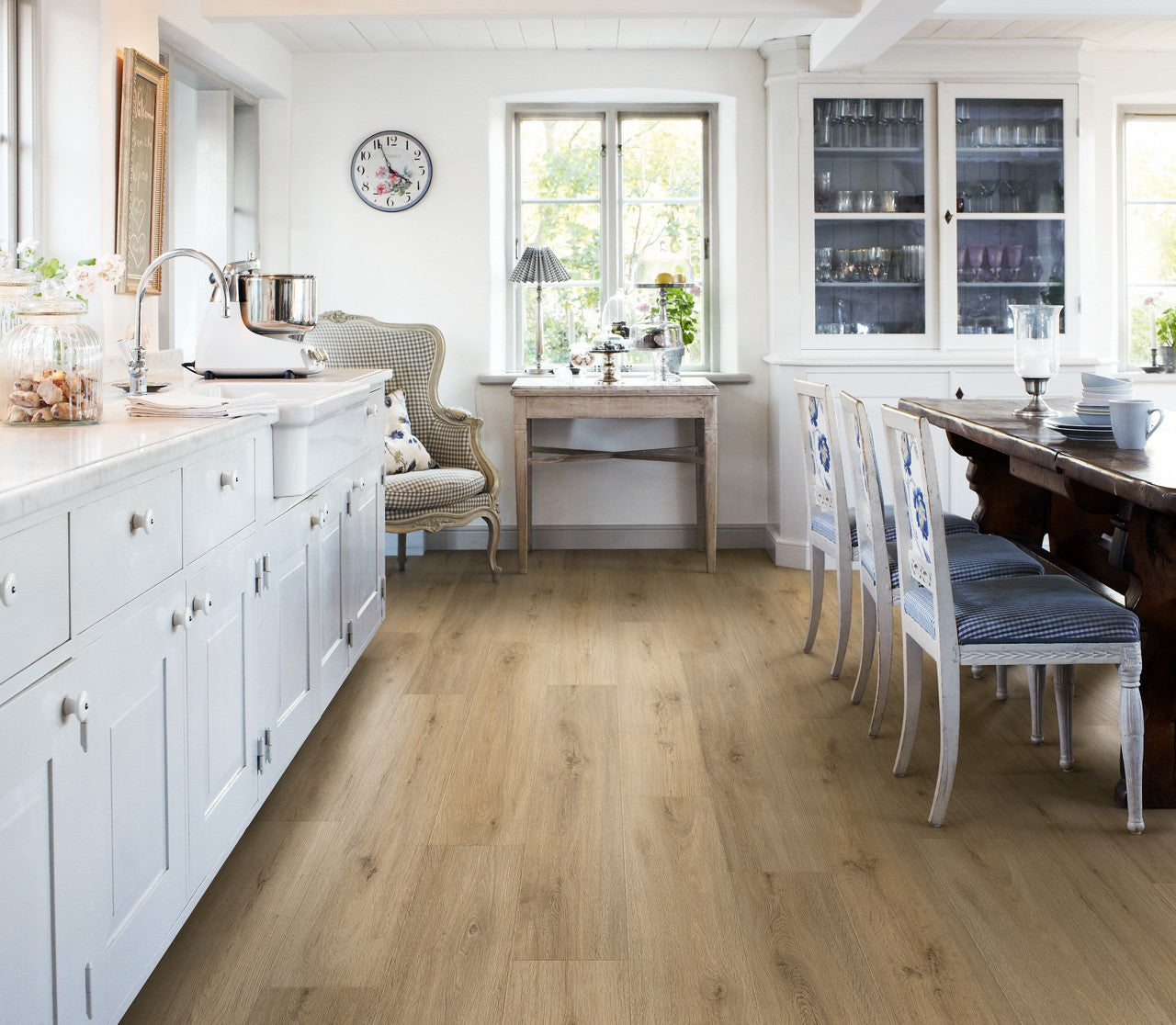 Il pavimento in laminato Drammen, con le sue doghe di dimensioni classiche e la discreta bisellatura ottica, dona tranquillità alla stanza, aggiungendo al contempo un aspetto naturale, da sottile a rustico, da chiaro a scuro. Lo strato superiore protettivo TitanX™ conferisce al pavimento un'elevata resistenza all'usura e, grazie ad AquaSafe, il pavimento è resistente all'acqua e non desta preoccupazioni. Drammen è facile e veloce da posare con il sistema a incastro Uniclic®.